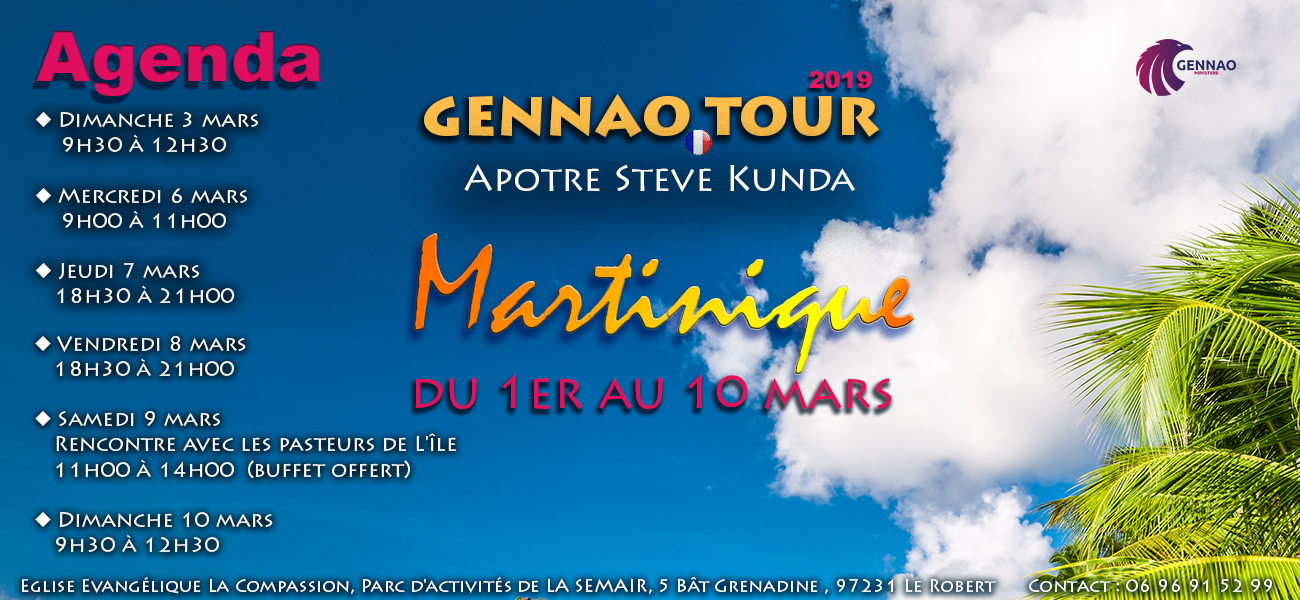 EGLISE ÉVANGÉLIQUE LA COMPASSION Parc d'activités de la Semair 6Bât Grenadine, Martinique, FranceLe couple apostolique Kunda vous convie à une semaine de réunions de réveil du 1er au 10 mars 2019 qui aura lieu à la Martinique à l’église évangélique «La Compassion». C’est avec plus de 15 ans de service que le couple apostolique arrache, renverse, rebâtit, plante, édifie et console dans le but de fortifier, de soutenir et d’encourager les églises qu’il visite.